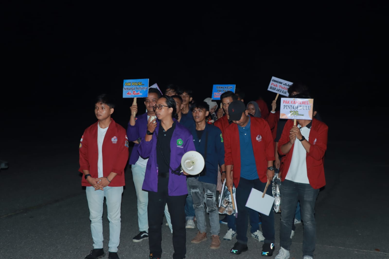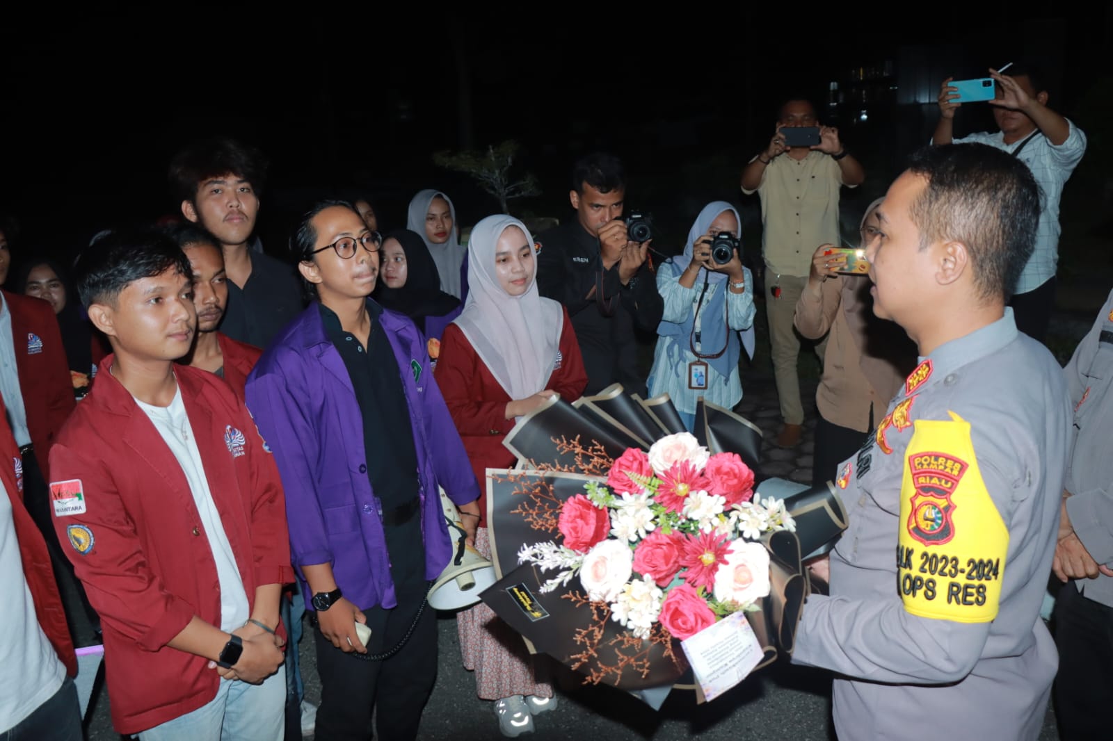 Sesampainya di sana para mahasiswa membawa buket bunga, kopi, dan berbagai meme. Dan diberikan langsung kepada Kapolres Kampar AKBP Ronald Sumaja yang didampingi para (Para Pejabat Utama) PJU Polres Kampar.