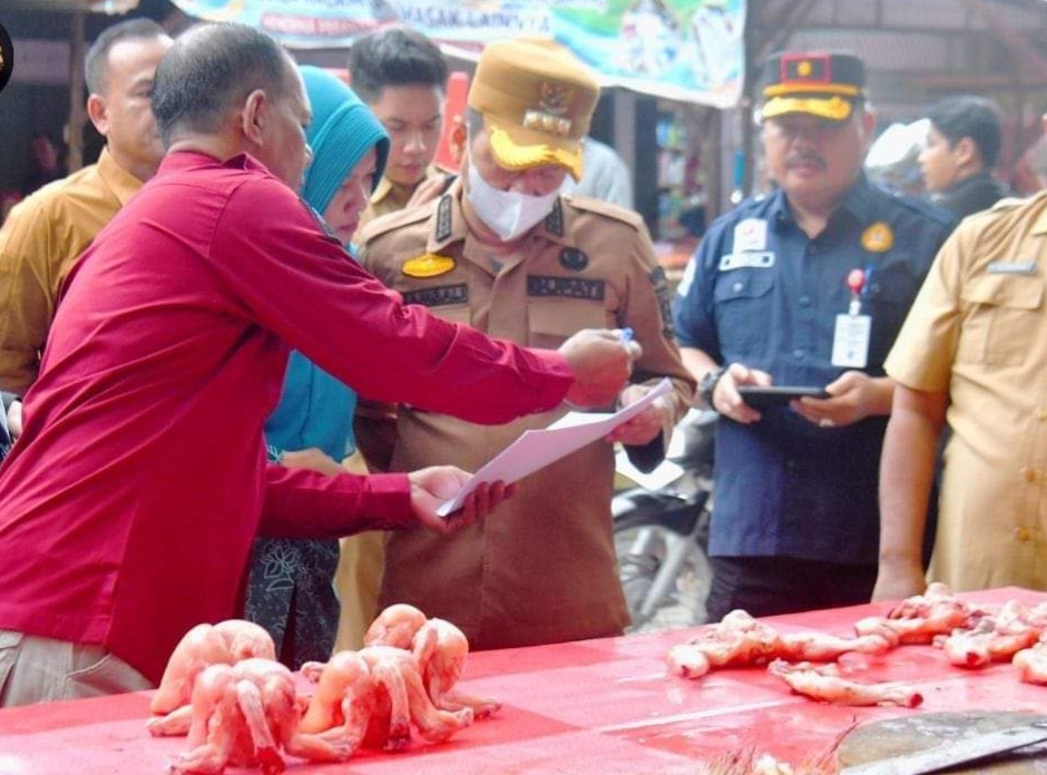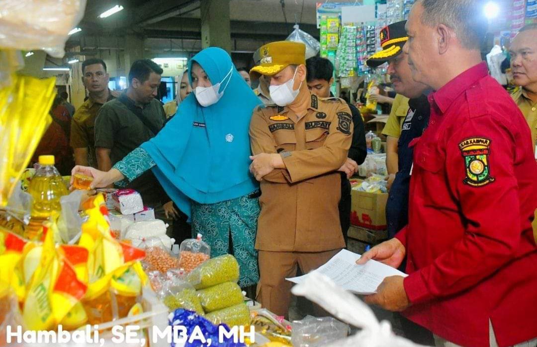 Bangkinang,-Penjabat Bupati Kampar, Hambali, SE, M.BA, MH, melakukan peninjauan harga bahan pokok di Pasar Inpres Bangkinang terkait isu kenaikan harga bahan pokok di Kabupaten Kampar. Didampingi Asisten Bidang Ekonomi dan Pembangunan Suhermi, ST, Kepala Dinas Koperasi dan Perdagangan Kabupaten Kampar Drs. H. Dendi Zulhairi, M,Si, Plt. Kepala Dinas Kominfo Kampar Irwan, AR, Kepalq Dinas Ketapang diwakili Kabid keamanan pangan Atma Wijaya, SP, M,si serta Ketua TP-PKK Kabupaten Kampar Ricana Dyanti Hambali, dan Kabid Perdagangan Sostra.