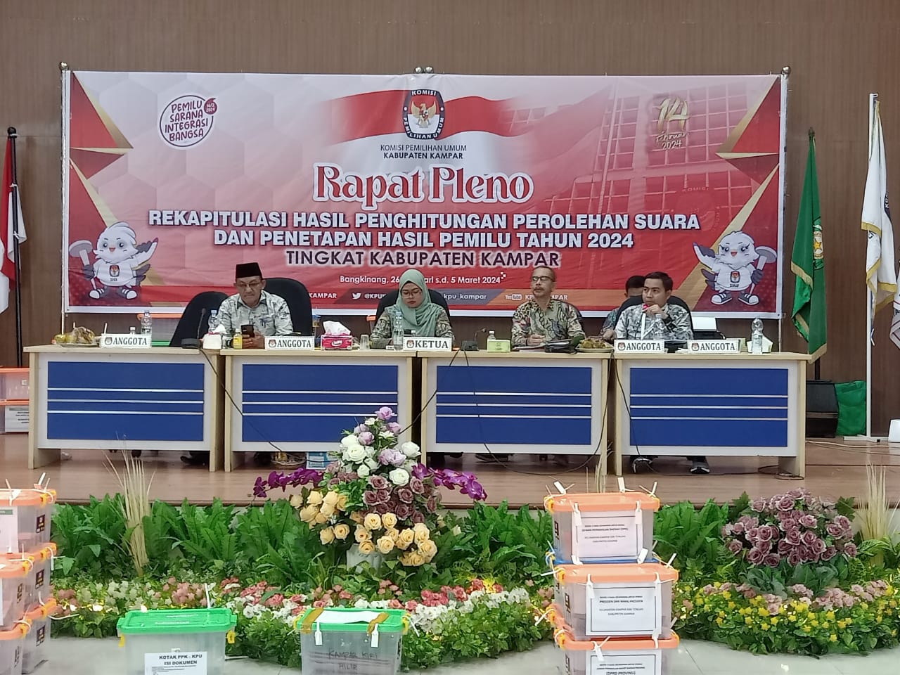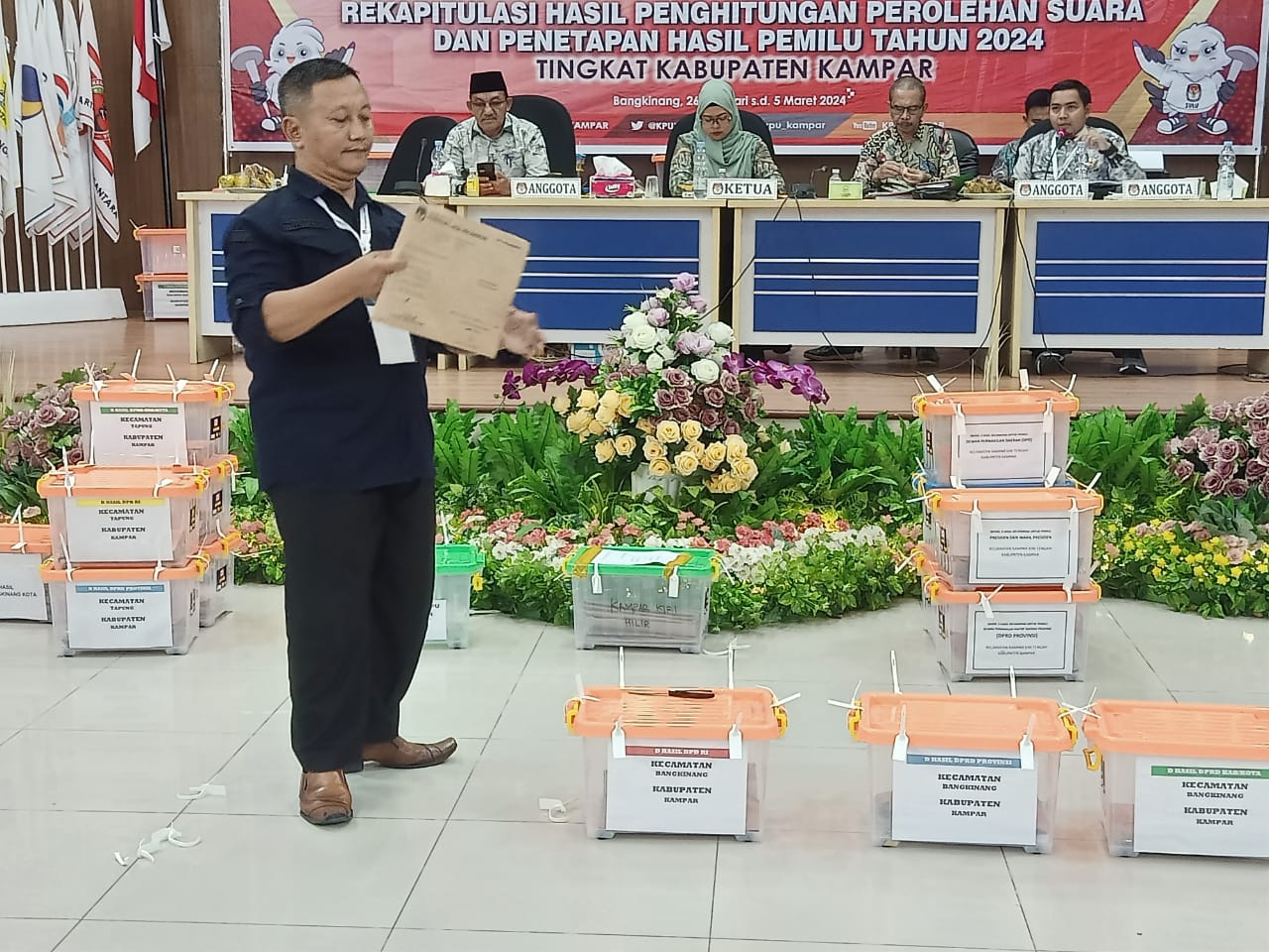 Ketua Komisi Pemilihan Umum Kabupaten Kampar Hj Maria Aribeni yang dikonfirmasi melalui Anggota Ahmad Dahlan, Kamis (29/02/2024) dini hari menyampaikan bahwa pagi tadi dimulai dari kecamatan XIII Koto Kampar dan terakhir malam yakni Kampar Kiri Hilir.