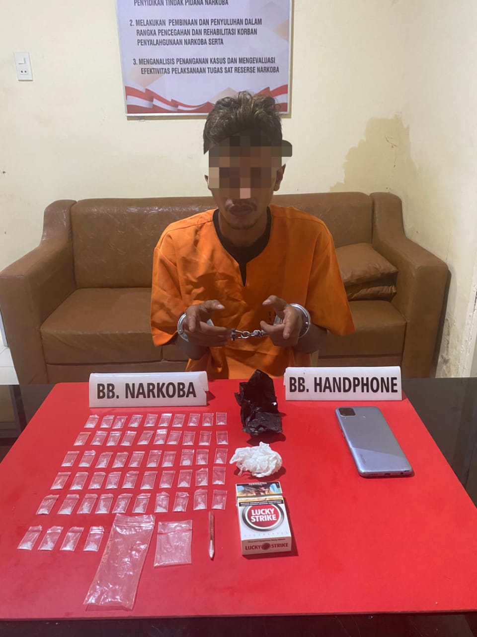 TAMBANG- EN (26) warga Desa Aur Sati diamankan Satnarkoba Polres Kampar (Tim Ojoloyo), pasalnya pelaku terbukti mengantongi 54 Paket Diduga Narkotika jenis shabu dengan Bruto 7.50 gram, Jumat (19/4/2024) sekira pukul 14.30 WIB.