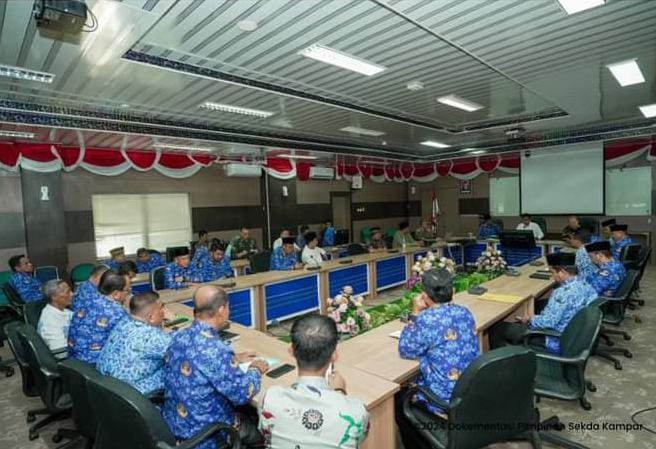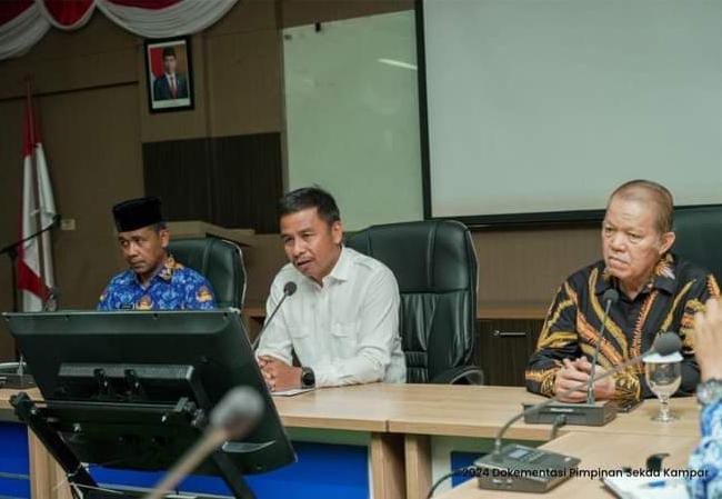 BANGKINANG – Pj Sekda kampar, Ahmad Yuzar mewakili Pj Bupati Kampar pimpin rapat persiapan ‘baolek godang’ bersama Prof. Yusri Munaf yang merupakan selaku panitia pengarah acara baolak godang tersebut. Rapat ini digelar di aula kantor Bupati Kampar, Kamis (2/5/2024).