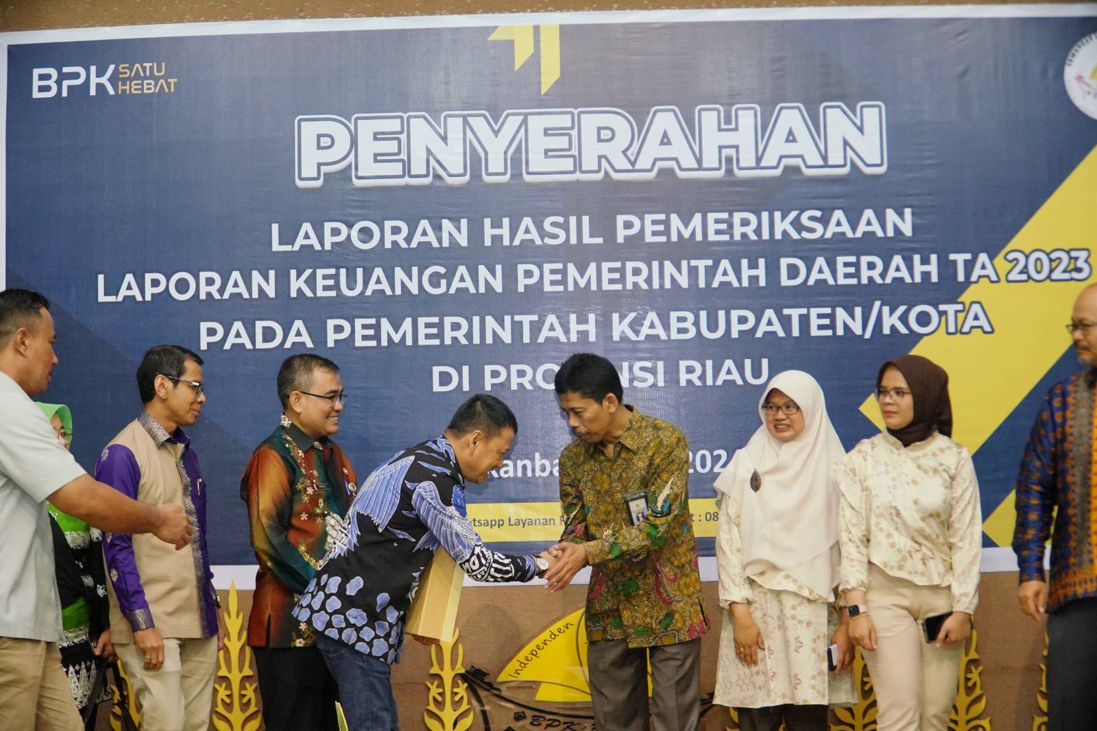 Pekanbaru — Pemerintah Kabupaten Kampar kembali meraih opini Wajar Tanpa Pengecualian (WTP) untuk ke delapan kali berturut-turut terhadap Laporan Hasil Pemeriksaan (LHP) Laporan Keuangan Pemerintah Daerah (LKPD) Tahun Anggaran 2023. Pj Bupati Kampar H. Hambali, SE.MH dan Ketua DPRD Kampar Muhammad Faisal, ST langsung menerima Laporan Hasil Pemeriksaan LKPD TA 2023 tersebut dari Kepala Badan Pemeriksa Keuangan (BPK) RI Perwakilan Provinsi Riau Jariyatna, S.E., M.M., Ak., CPA., CSFA., CPSAK.