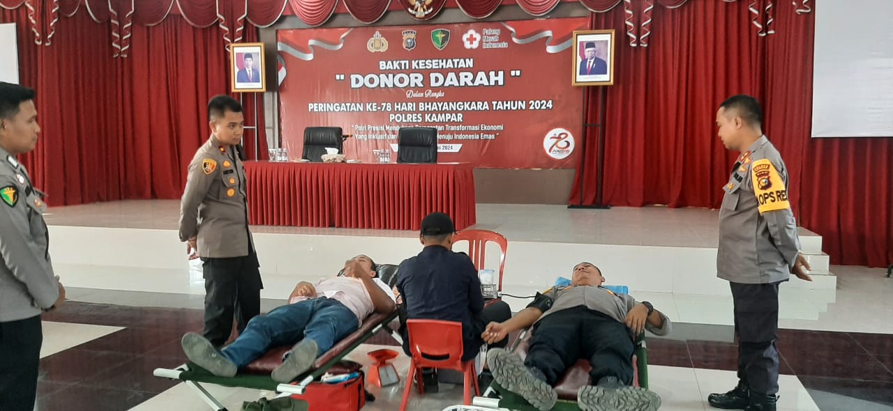 Kegiatan donor darah ini dalam rangka memperingati Hari Bhayangkara ke-78 tahun 2024 dengan Petugas pelaksana kegiatan donor darah ini dari Poliklinik Polres Kampar bekerjasama dengan PMI Kabupaten Kampar.