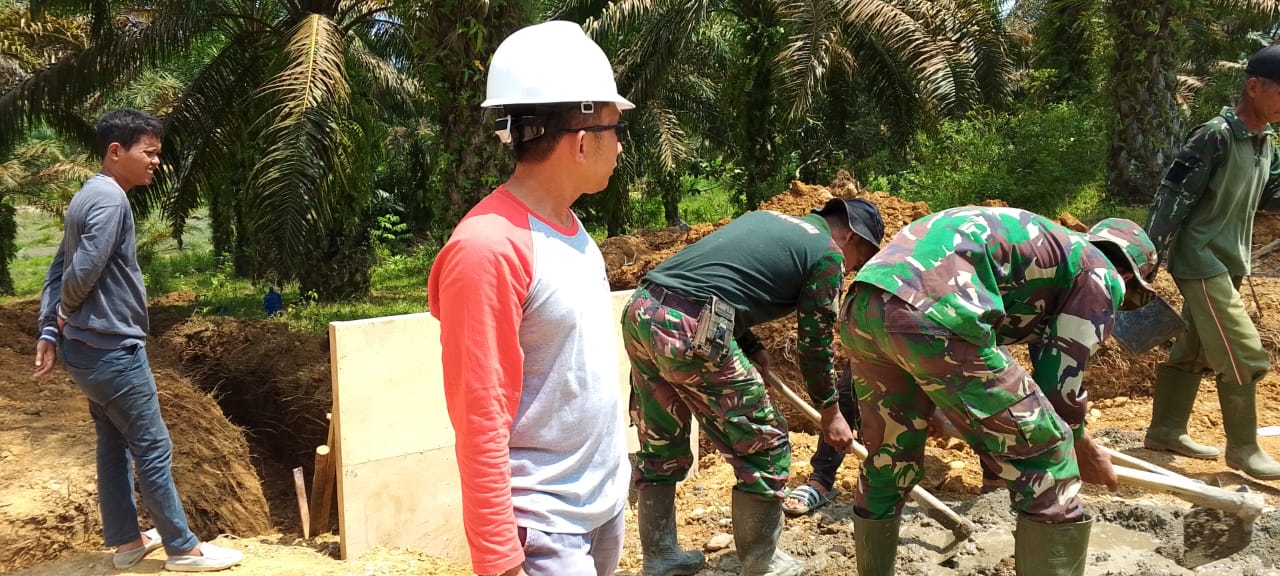 KAMPARKIRIHULU – Pengerjaan pengecoran lining (kupingan) 9 sasaran gorong-gorong sasaran fisik program TNI Manunggal Membangun Desa (TMMD) Reguler ke-121Kodim 0313/KPR di Desa Tanjung Belit Selatan, Kecamatan Kampar Kiri Hulu, hampir rampung, Senin (29/07/2024).