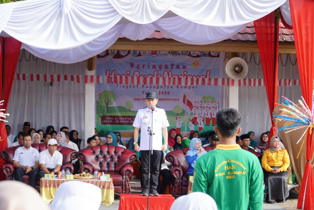 Pj. Bupati Kampar Hambali, SE, MH yang didampingi langsung oleh Pj Ketua TP PKK yang juga sebagai Bunda PAUD Kabupaten Kampar Ricana Djayanti Hambali memimpin apel peringatan Hari Anak Nasional ke-40 untuk tingkat Kabupaten Kampar tahun 2024 yang bertemakan ‘Anak Terlindungi Indonesia Maju’ yang bertempat di Lapangan Upacara SDN 001 Salo Kabupaten Kampar, pada Rabu (21/08/2024).