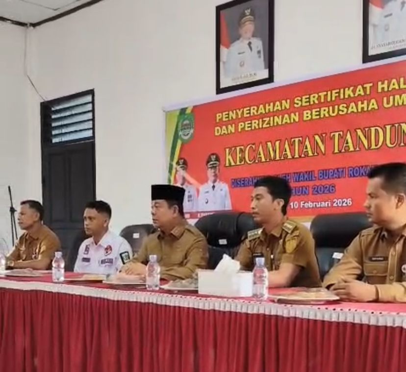 Tandun – Pemerintah Kabupaten kembali menunjukkan komitmennya dalam mendukung pertumbuhan usaha masyarakat melalui kegiatan penyerahan sertifikat halal dan perizinan berusaha bagi pelaku usaha di Kecamatan Tandun. Acara yang berlangsung dengan tertib dan penuh antusiasme ini dihadiri oleh Wakil Bupati, jajaran pemerintah kecamatan, serta para pelaku usaha mikro dan kecil yang menjadi penerima manfaat program tersebut.
